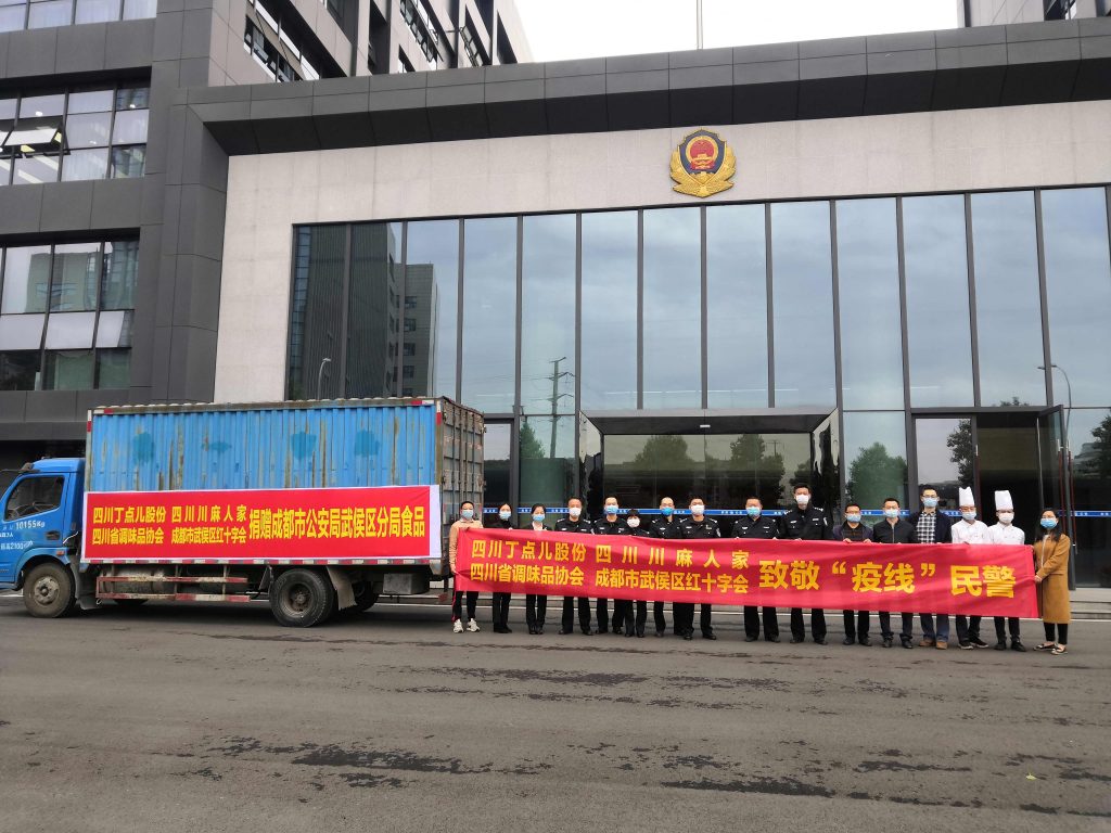 ? ? ? ? 3月27日,丁點(diǎn)兒股份積極響應(yīng)四川省調(diào)味品協(xié)會(huì)發(fā)起關(guān)于在全省調(diào)味品行業(yè)開展共赴戰(zhàn)“疫”,“味”問(wèn)民警活動(dòng)的號(hào)召,再次通過(guò)成都市武侯區(qū)紅十字會(huì)向成都市公安局武侯區(qū)分局捐贈(zèng)600余件由子公司“四川川麻人家食品開發(fā)有限公司”提供的川味調(diào)料。公司副總經(jīng)理龐永強(qiáng)先生、四川省調(diào)味品協(xié)會(huì)秘書長(zhǎng)王三躍先生、武侯區(qū)公安分局、武侯區(qū)紅十字會(huì)等相關(guān)領(lǐng)導(dǎo)參與了此次捐贈(zèng)活動(dòng)。