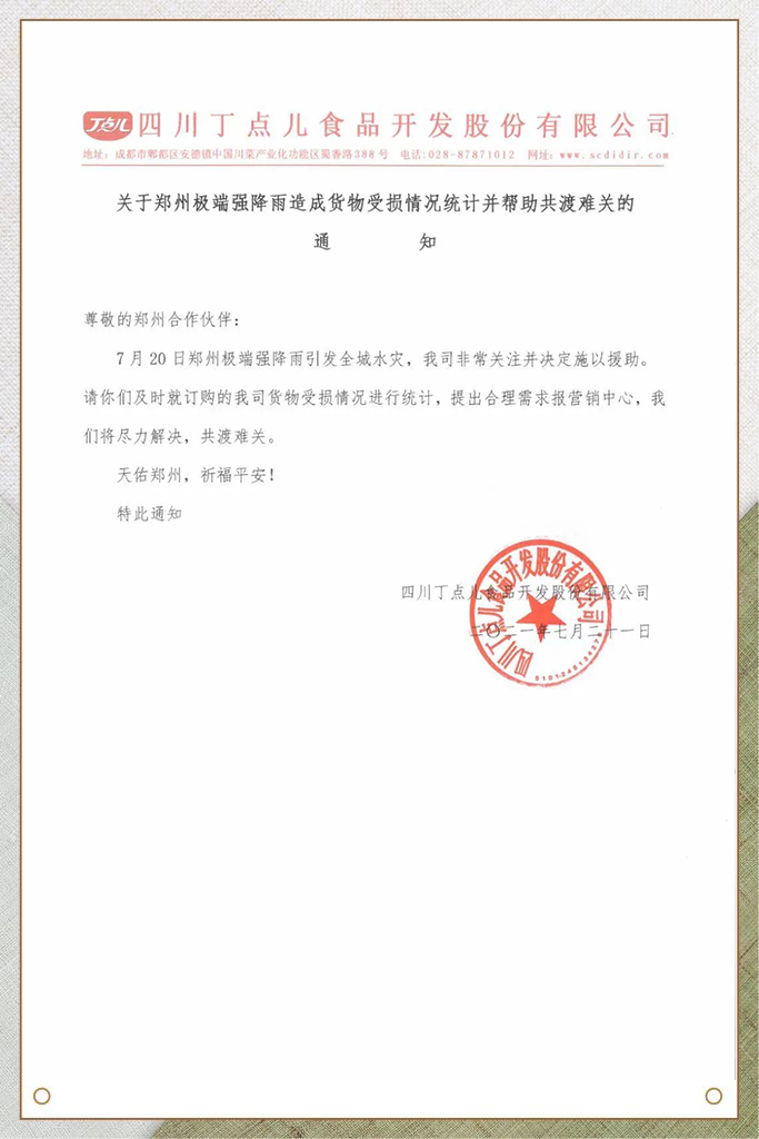 關于鄭州極端強降雨造成貨物受損情況統(tǒng)計并幫助共度難關的通知