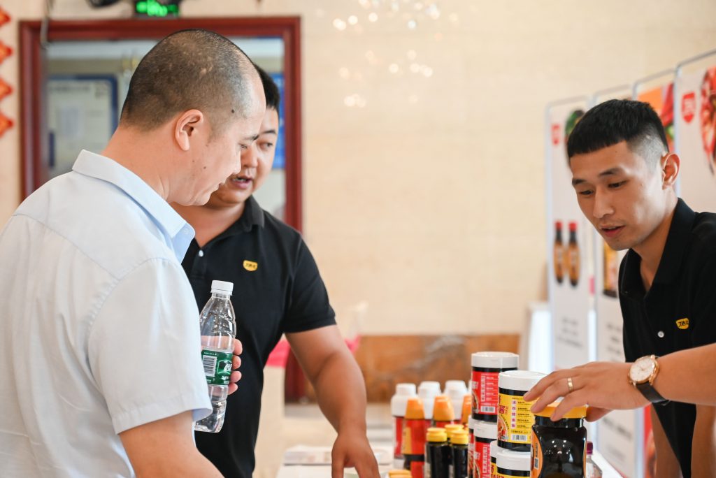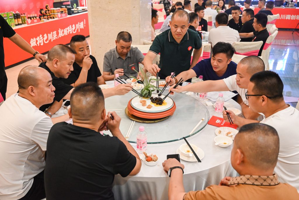 在丁點(diǎn)兒藤椒油、老壇酸菜醬、椒麻雞汁、干鍋醬等的加持下,每道菜品香飄四溢,引得眾人贊不絕口。大家紛紛來(lái)到丁點(diǎn)兒高品質(zhì)特色川調(diào)產(chǎn)品展示區(qū),咨詢了解、溝通合作。