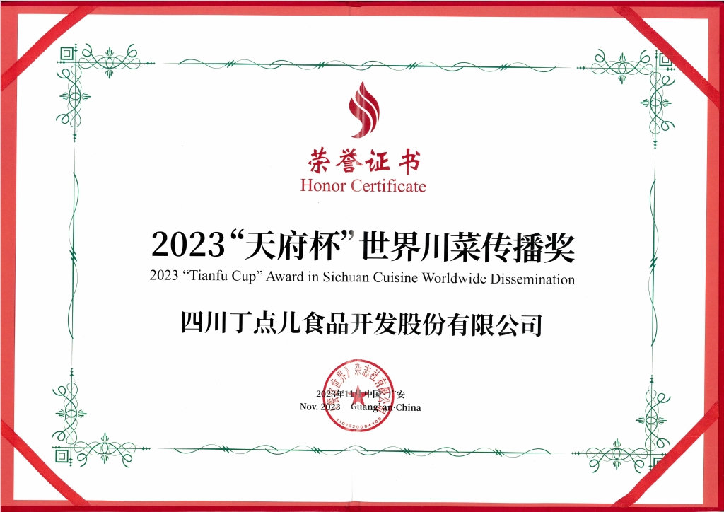 憑借出色的企業(yè)影響力和巨大的發(fā)展?jié)摿?,丁點兒食品在這一年又?jǐn)孬@了多項榮譽?!澳甓瘸壠放浦恰?、2023“天府杯”世界川菜傳播獎、第十一屆中國食材電商節(jié)-優(yōu)質(zhì)企業(yè)推薦等稱號,充分展示了行業(yè)對丁點兒食品實力的肯定。