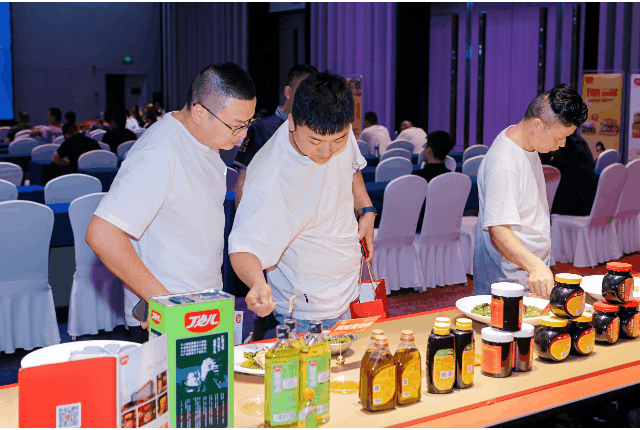 在丁點兒高品質(zhì)特色川調(diào)產(chǎn)品展示區(qū),椒麻雞汁、干鍋醬、麻得倒純萃花椒油等豐富的產(chǎn)品吸引了眾多參會人員駐足詢問了解。口味穩(wěn)定,快速出餐,可優(yōu)化菜品成本等產(chǎn)品優(yōu)勢,引得大家紛紛咨詢合作,用丁點兒青花椒麻辣醬烹飪的翡翠鮮椒雞更是獲得了品鑒人員的一致好評。