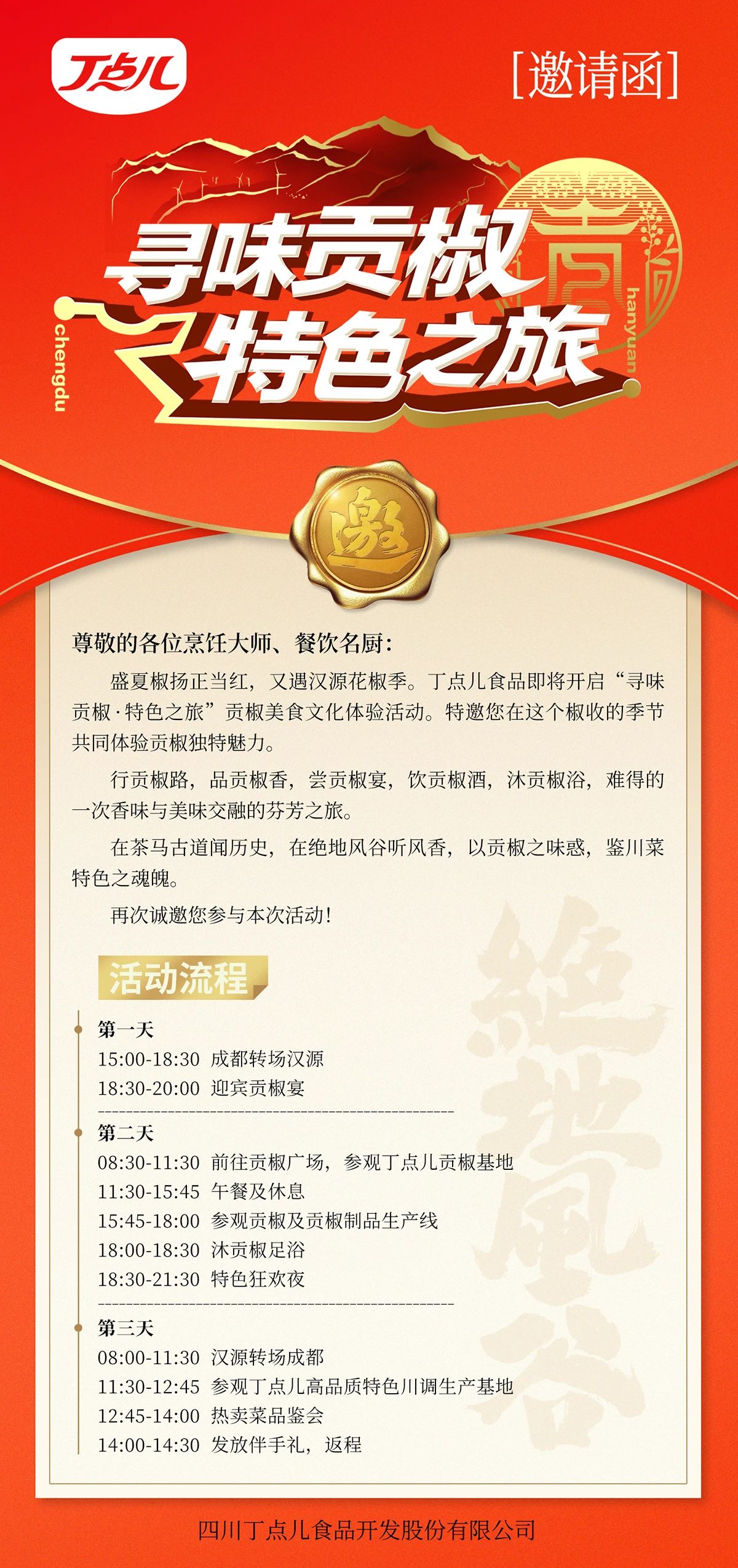 8月至9月中旬,丁點兒食品誠邀全國各地餐飲烹飪大師、名廚和餐飲老板參與2024“尋味貢椒·特色之旅”營銷體驗活動,我們在“川菜之城”郫都,“貢椒之鄉(xiāng)”漢源等著您!我們將持續(xù)報道,敬請關注。